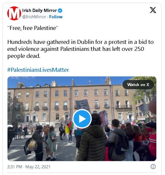 And it wasn't a one-off. As you probably know, Hamas flags have been held and carried, and Hezbollah flags, in the streets of Dublin in the last number of years. I think at the last pro-Israeli demo there was a PFLP flag. There were racist chants here at the embassy last weekend.