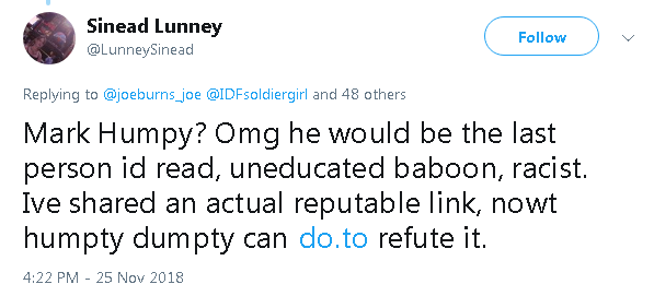 describes me as an "uneducated baboon racist"