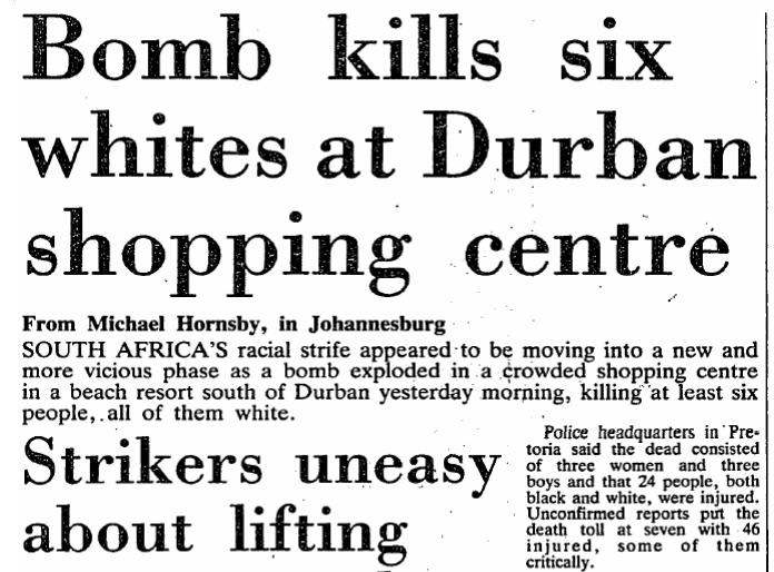 - 18 Jan 1963. Bombing of office of "Die Nataller" newspaper, Durban.