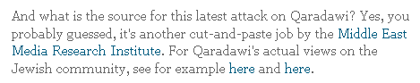 Islamophobia Watch is trying to pretend that Al-Qaradawi has no problem with Jews.
