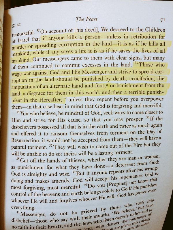 which immediately follows it, and somehow is never quoted by the anti-counterjihad people: "The only reward of those who make war upon Allah and His messenger and strive after corruption in the land will be that they will be killed or crucified, or have their hands and feet on alternate sides cut off, or will be expelled out of the land. Such will be their degradation in the world, and in the Hereafter theirs will be an awful doom;"