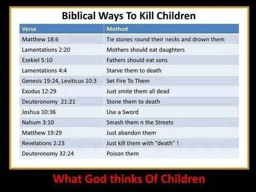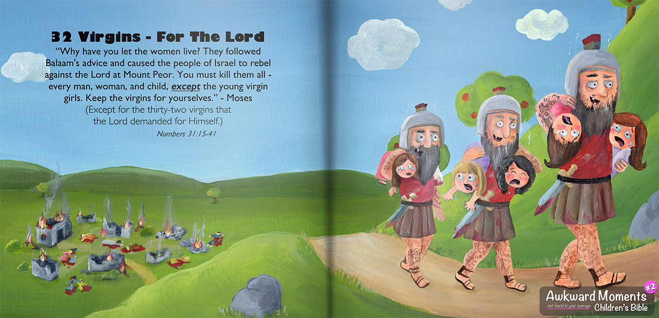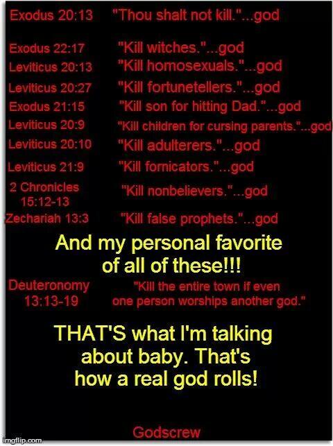 "In much of the Bible, especially the Old Testament, there are laws that command that people be killed for absurd reasons such as working on the Sabbath, being gay, cursing your parents, or not being a virgin on your wedding night. ... There are also countless examples of mass murders commanded by God, including the murder of women, infants, and children."