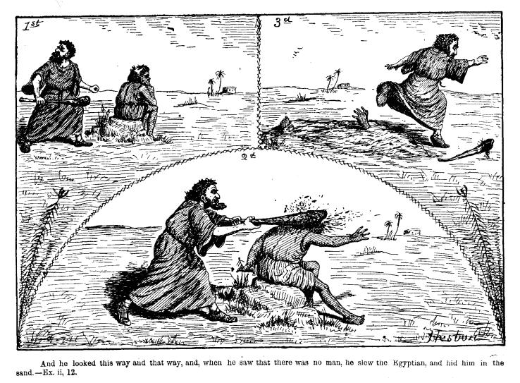Egyptian bloke hits a Hebrew. So Moses kills the Egyptian bloke and hides his body.