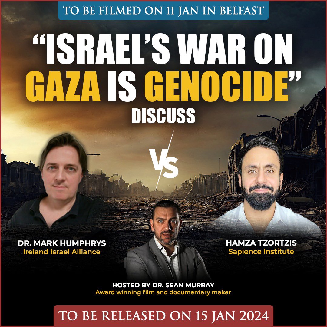 I debated on Israel and Gaza against Hamza Tzortzis in Belfast on 11 Jan 2024. It was a relaxed, long-format debate. Tzortzis behaved badly, with constant interrupting, topic changes every 10 seconds, name calling and personal abuse. I stayed calm and got across the points I wanted, a world view that people rarely hear. Tzortzis never listened to a word I said.