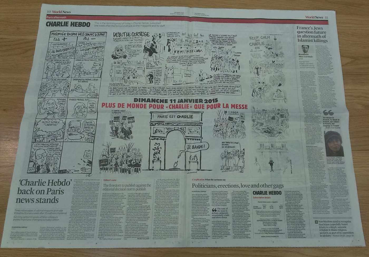 runs two whole pages of Charlie Hebdo "solidarity" on 14 Jan 2015.