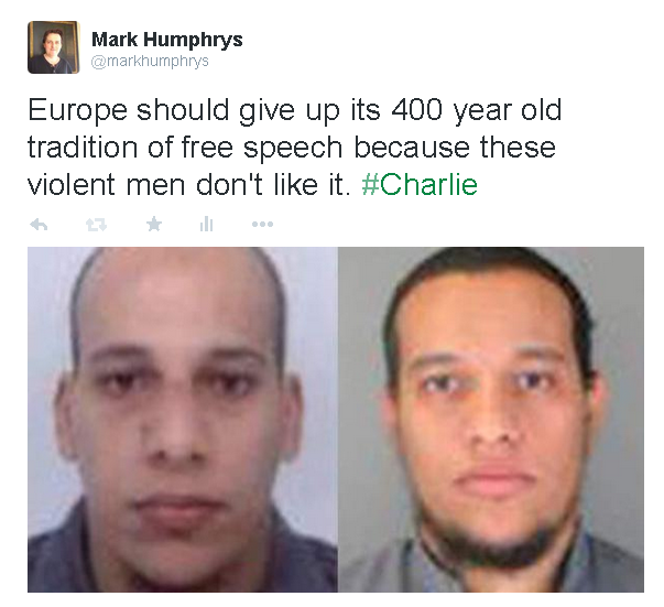 "Stephane Charbonnier, the paper's publisher, was killed today ... It is too bad that he didn't understand the role he played in his tragic death. ... when asked why he insults Muslims, he said, "Muhammad isn't sacred to me." Had he not been so narcissistic, he may still be alive."