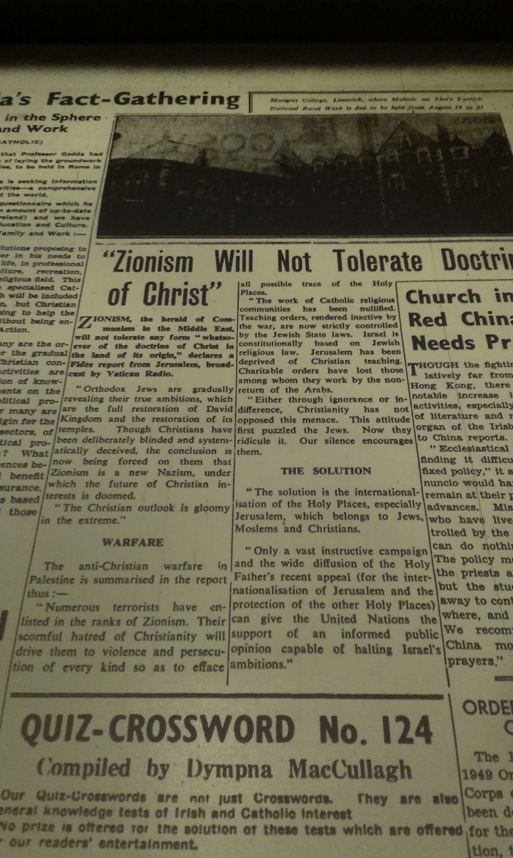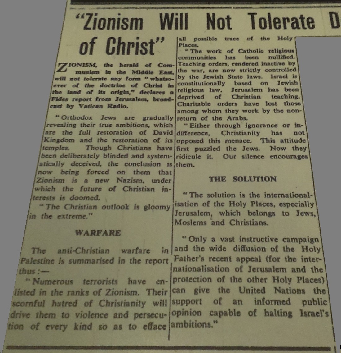 Shows Irish and European Catholic reaction to the foundation of Israel in 1948.