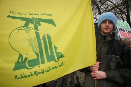 Hezbollah terrorist flag openly displayed at anti-Israel march, Dublin, Apr 2008.