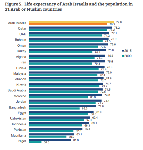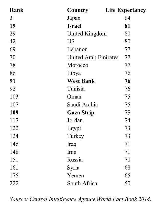 Here is life expectancy. Gaza and the West Bank have higher life expectancy than Jordan, Syria, Egypt, Iraq, and even Turkey, which sends aid to Gaza, on ships full of jihadis.