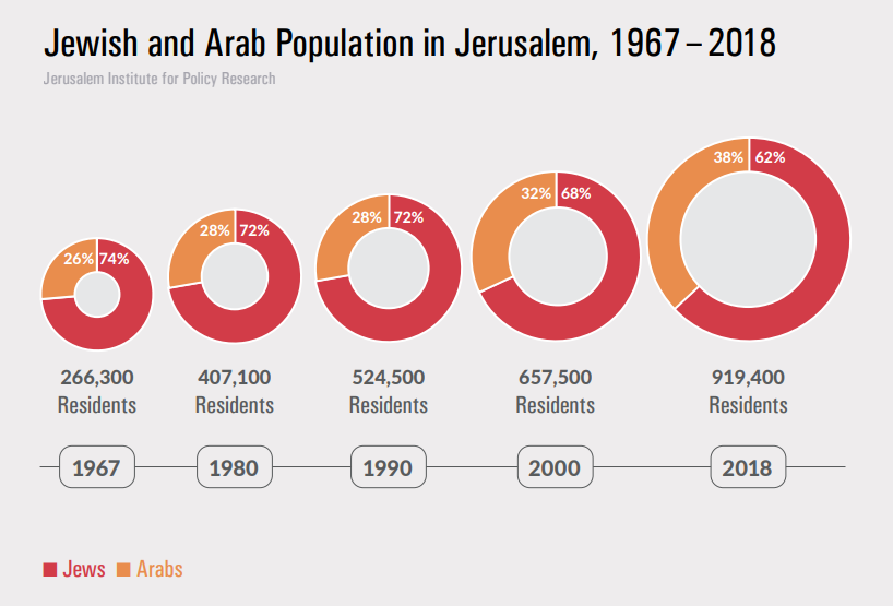 Here's the ethnic cleansing of the Arabs of Jerusalem. They've been driven from an appalling tiny number of people, in the orange here [on LHS], up to this huge amount here [on RHS]. So they've been, sadly, vastly increased in numbers. But I guess the ethnic cleansing will kick in at some point and they'll start reducing. That's Jerusalem.