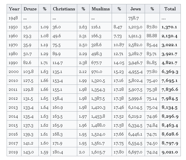 So now here's the ethnic cleansing - put sarcastically of course. But people talk about the ethnic cleansing of the Arabs. So here's the appalling ethnic cleansing of the Arab Muslims. So just look at the Muslim column. So we have 500,000 in 1980, and 1.6 million there [in 2019].