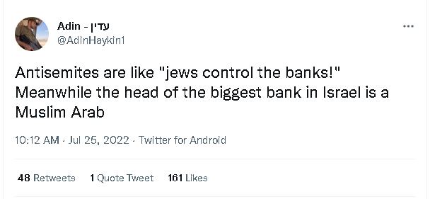 Now here's a great little tweet from somebody I follow. And he says: Antisemites say Jews control the banks. We really messed up, guys, because the head of the biggest bank in Israel is an Arab Muslim. And that's true. The head of Bank Leumi, appointed in 2019, is an Arab Muslim. So obviously, they're doing the international conspiracies wrong as well, and letting the Arab Muslims in on those too.