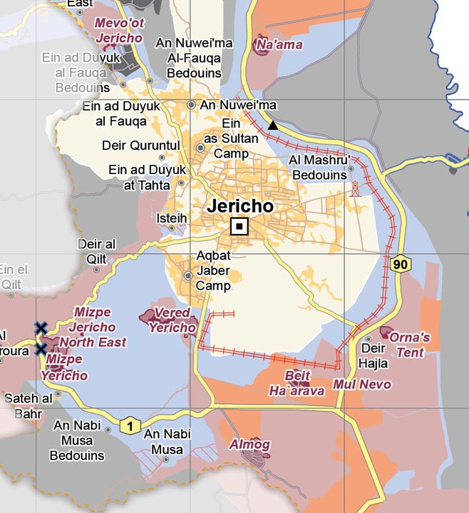 Purple: Jews can live here in this area. Jews lived here [central Jericho] for 2,500 years or something, but they can't live here anymore. They can't even go in there anymore without an army escort. Palestinians can't get in here [purple area] without security checks. Because of the fear of terrorism. And they can't live there. The whole thing is an absolute mess.