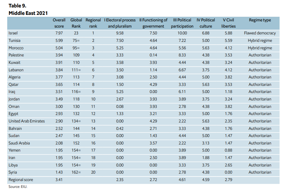 Now that's just a list of elections. And then we can go and we can look at how people rank Israel. So here is The Economist who have a thing called the Democracy Index: