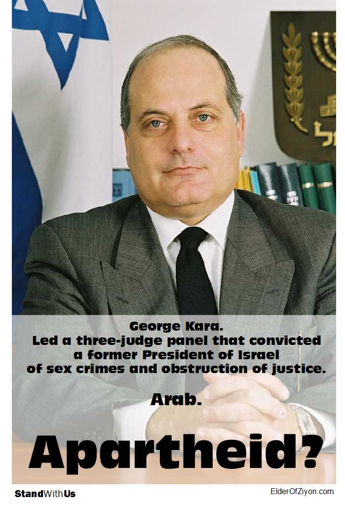 Right, so here's an Arab Supreme Court judge. Salim Joubran. And not just on a one-off basis. For 14 years he was a judge of the Supreme Court. I mean, that's a serious position. That's a serious position of power over Jews, and everybody, Jews and Arabs, all citizens. Okay. Well, that's interesting. How about this guy?So an Arab judge who jailed an Israeli President, I mean, how many people in Ireland even know this happened. You know, an Israeli President was convicted of sexual assault. And the judge who jailed him was Arab. So that's this fellow here, George Karra. He jailed the Israeli President for rape. So you know, how can that happen? Well, that can happen in a society like ours, where everybody has equal rights. That's it. That's how that kind of thing can happen.