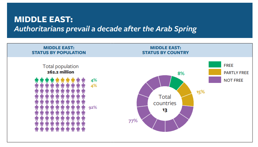 And in the Middle East, one country out of 13 is "Free". Guess which country. It's Israel, of course. And look at all this purple. These are the worst countries in the world. This is the worst category in the world. And almost the entire Middle East is purple. Now these are real things that Freedom House and The Economist are talking about. They're not just made up.