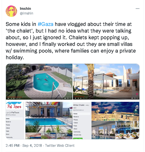 There's a channel, an account on Twitter, I follow called Imshin. And what she does is "The Gaza you don't see". And she always goes looking at nice things in Gaza that you wouldn't think about, you wouldn't see in the media because they don't fit the narrative. And she discovered 640 holiday chalets that families use in Gaza. These are actual real places. They actually exist. And they could be on your newspaper.
