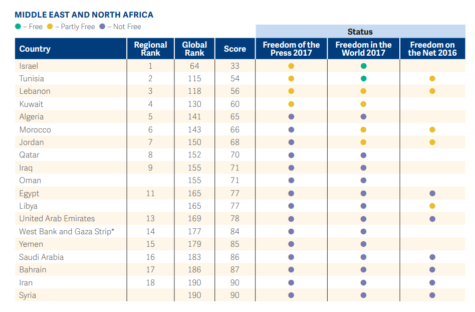 Again, this is freedom of the press. Israel - top country in the Middle East, despite all the problems and all the issues and whatever. It's nothing compared to these countries [at bottom of chart], where freedom of the press does not exist. In which the regimes do not believe in the entire concept of freedom of the press. So why are we even talking about Israel? We should spend all our time talking about Iran and Syria and Saudi Arabia and places like that.
