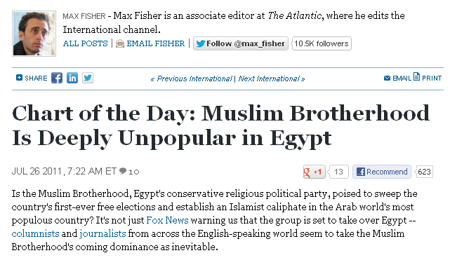 "In the 2011 parliamentary elections, three-quarters of the vote went to either the Muslim Brotherhood or their principal rivals, the Even More Muslim Brotherhood. So, statistically speaking, a fair few of the "broad-based coalition" joining the Coptic Christians and urban secularists out on the streets are former Morsi guys.