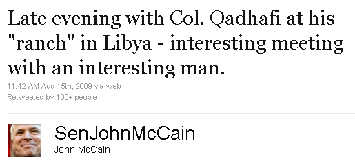 John McCain pals around with a terrorist (Gaddafi) in 2009.