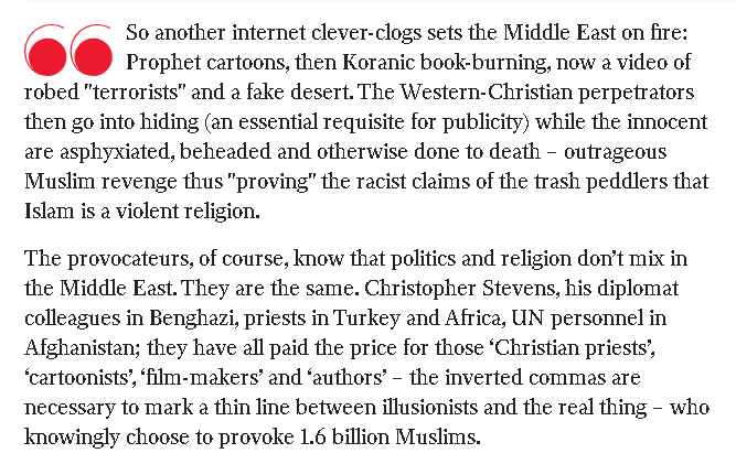 "So another internet clever-clogs sets the Middle East on fire ... outrageous Muslim revenge thus "proving" the racist claims of the trash peddlers that Islam is a violent religion."
