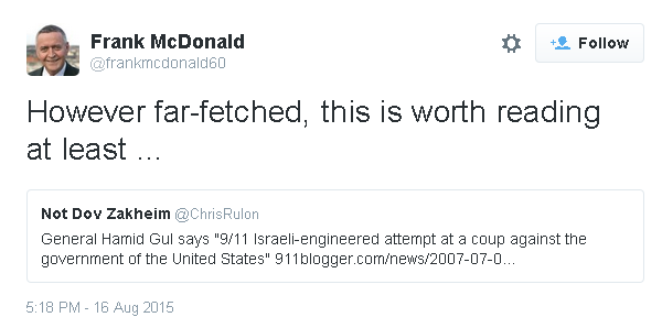 Frank McDonald, 16 Aug 2015, starts flirting with 9/11 trutherism.