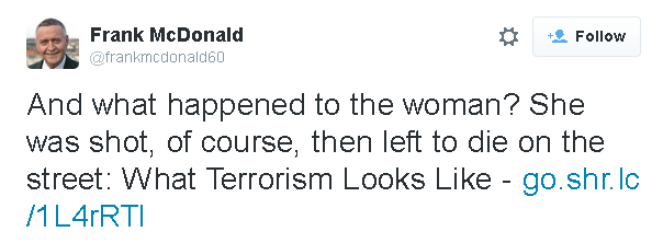 Frank McDonald, 8 Nov 2015, weeps for an injured female terrorist