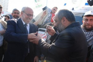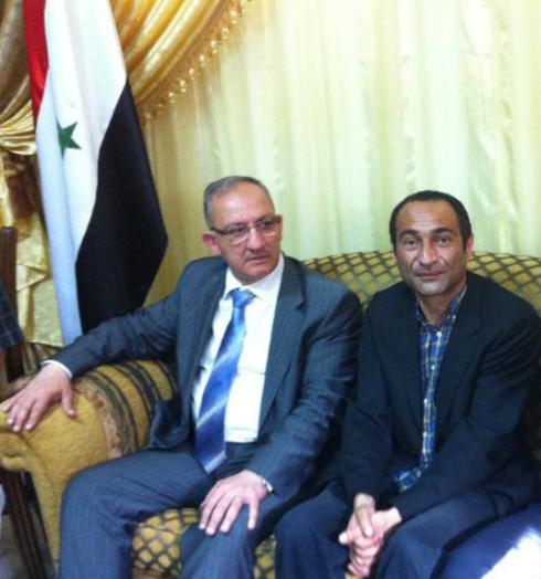 The leader of the depraved "Viva Palestina" convoy (right) is welcomed by a member of the Assad regime (left)