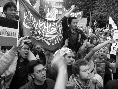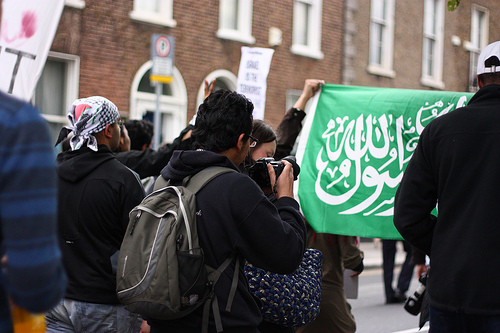 Islamic terrorist flag at protest in Belfast, 31 May 2010.