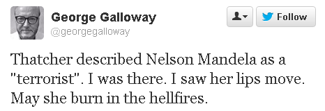 George Galloway reacted to the death of the democratically-elected British Prime Minister, Margaret Thatcher, 8 Apr 2013: