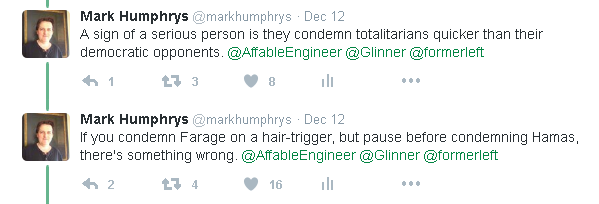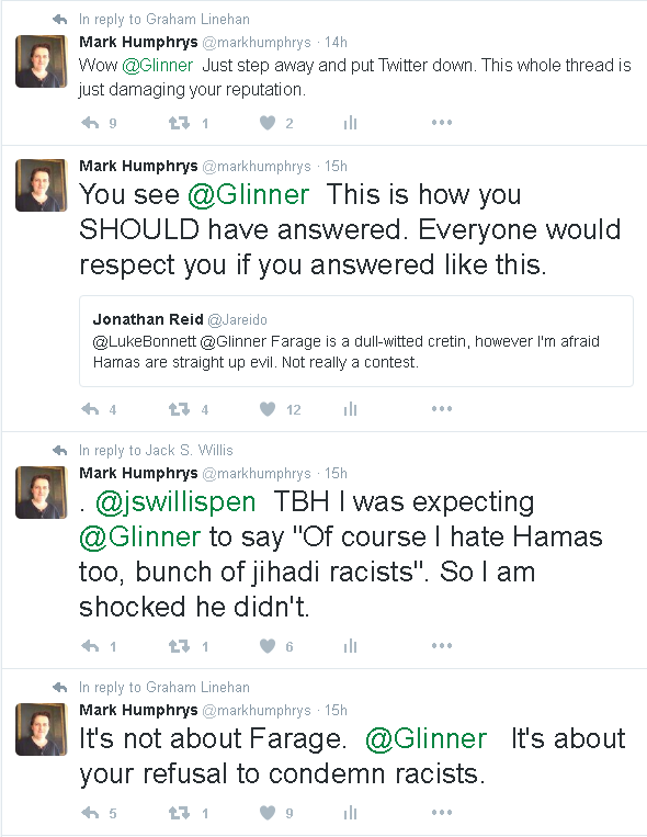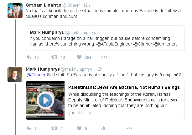 "I hate Farage, but of course I also hate Hamas, who are jihadi scum".