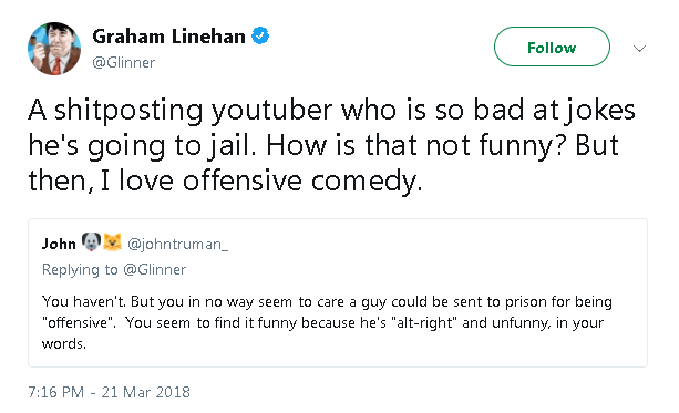 Also incredibly, Linehan supported his cancellation/prosecution for a Nazi joke.