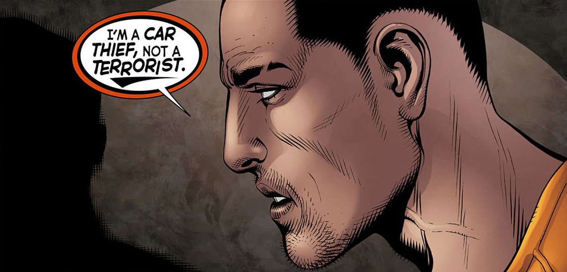 "The husky, olive-skinned Baz soon finds himself being interrogated by two dark-suited agents in a sequence of panels that hits on Islamophobia, illegal detentions, torture, and the war on terror."
