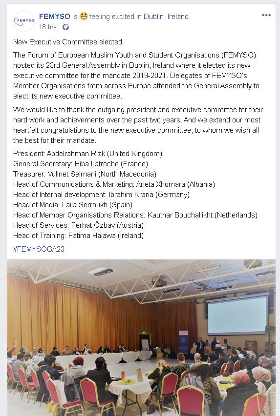 Fatima Halawa was elected to the committee of The Forum of European Muslim Youth and Student Organisations (FEMYSO).