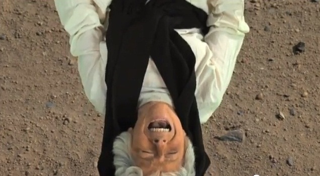 The camera cuts back to show her feet are tied with ropes to a camel; as it moves forwards, she is hoisted into the air.