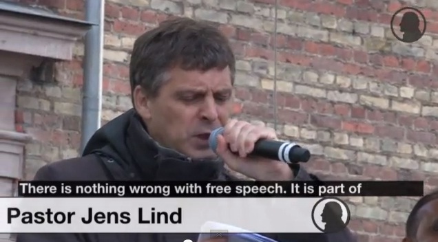 Christian pastor Jens Lind marches with Muslim fanatics against free speech in Denmark, 7 Oct 2012.