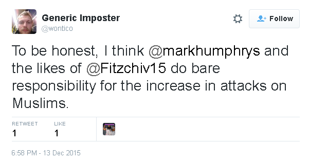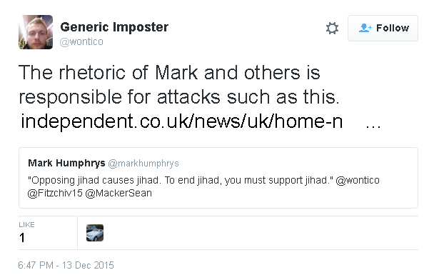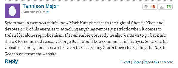 | Argue against Provos and lefties and Islamists using their own words, linking direct to their original writings, even travelling (in real life!) to visit archives and scan original documents. | Invents opinions that are not even held by me. No quote from me. No link to me. No links. No references. Asserts them as facts with no evidence. He might even be confusing me with someone else. But who needs facts when you are a revolutionary! |