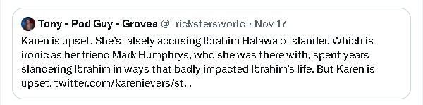 He says I "spent years slandering Ibrahim [Halawa] in ways that badly impacted Ibrahim's life."
