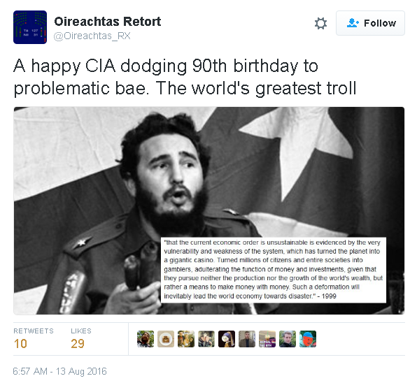 "Oireachtas Retort", 13 Aug 2016, sends birthday greetings to dictator and mass murderer