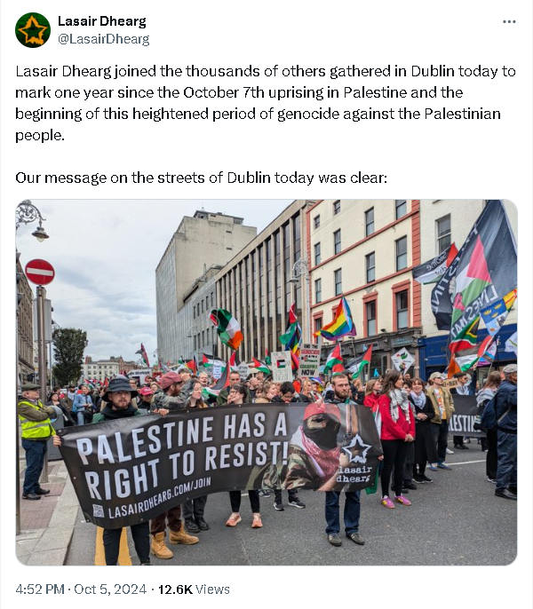 marching through Dublin on 31 Aug 2024 in front of the flag of the terrorist PFLP, which took part in the 7 October massacre.