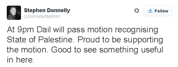 "When the late Brian Lenihan was Minister for Foreign Affairs, he supported the request of the Palestinian people for statehood on behalf of the Irish people. It is disappointing that the United States has apparently decided to veto the Palestinian bid. It is even more disappointing that the Tánaiste appears to be supporting President Obama's stance on the issue."