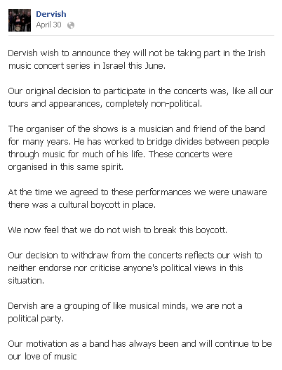 Dervish cancels their tour of Israel, 30 Apr 2012, after foolishly listening to