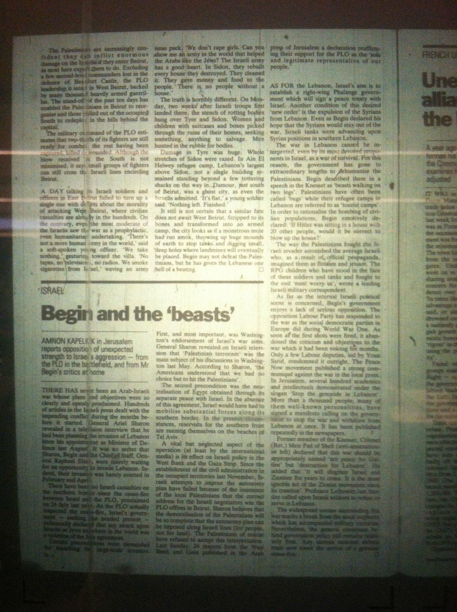 She claims the quote appears in "Begin and the 'beasts'", New Statesman, June 25, 1982.