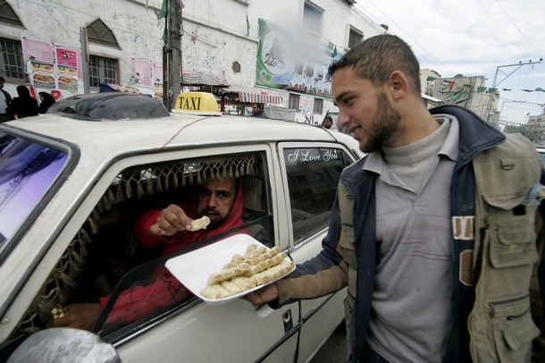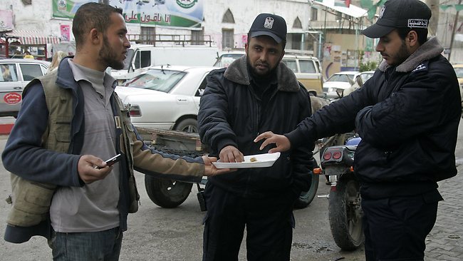 A Palestinian man hands out treats to Hamas "policemen" (i.e. terrorists) in Gaza.