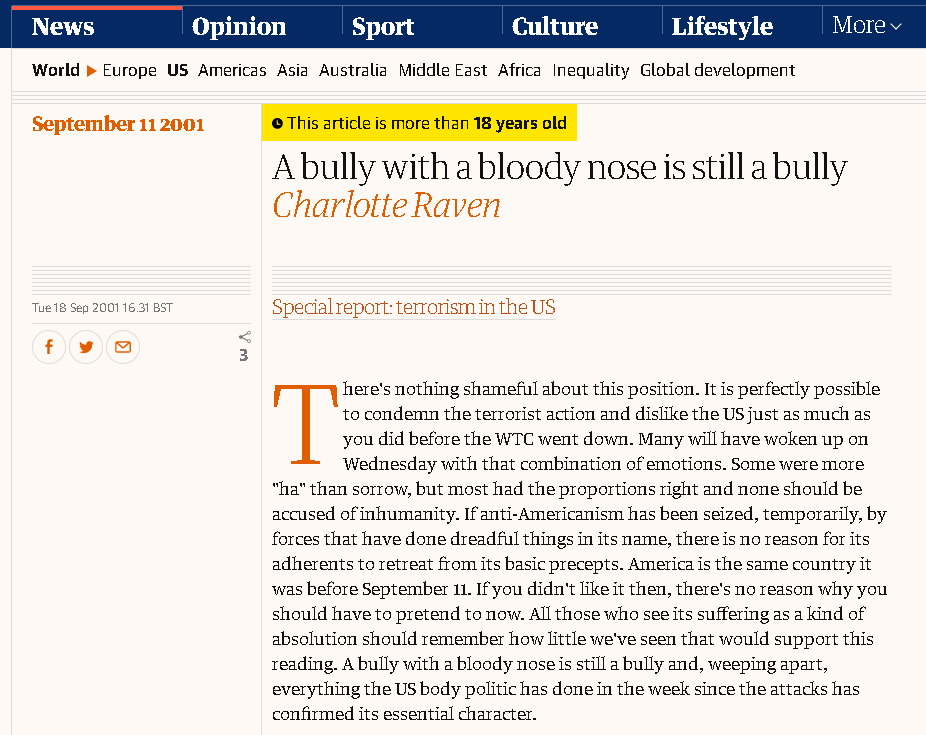 "when the shock had faded, more hard-headed reaction set in. This wasn't just the feeling that, however tactfully you dress it up, the United States had it coming. That is, of course, what many people openly or privately think. World bullies, even if their heart is in the right place, will in the end pay the price.
