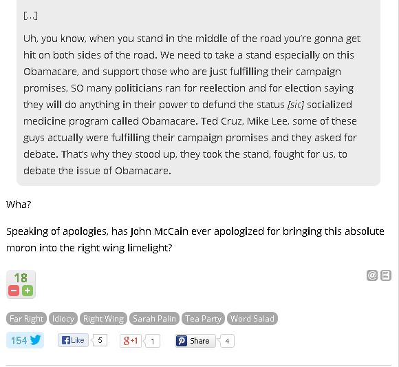Speaking of apologies, has John McCain ever apologized for bringing this absolute moron into the right wing limelight?"