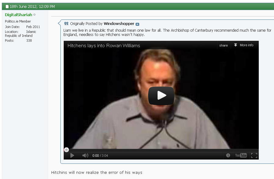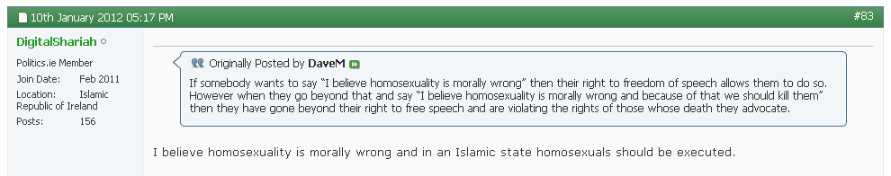 EireMuslim, 9 Dec 2011, openly supports religious oppression: