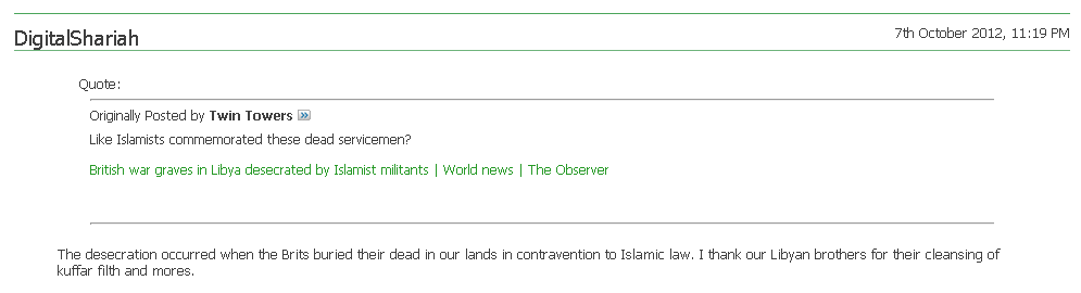 Islamic Vanguards, 4 Mar 2012, supports destroying Christian graves in Libya.