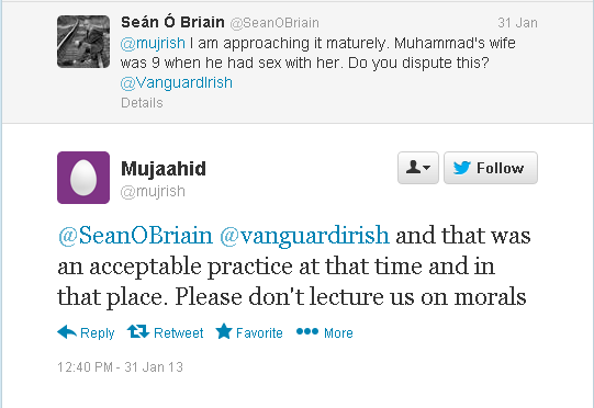 EireMuslim, 3 Feb 2012, not only supports expelling the Christian missionaries, he declares that proselytising is worse than terrorism!"What's worse than terrorism, or the encouragement of terrorism or indeed the praise of terrorism? It is the preaching, dissemination and distribution of materials that are detrimental to the eternal well-being of an individual".