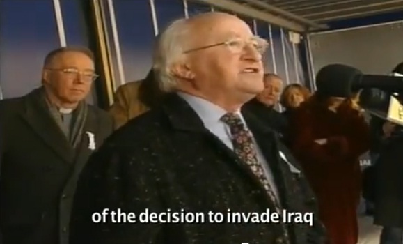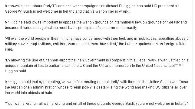 The truth we wish to declare today, on behalf of the Irish people, is that the author of this war, George Bush is not welcome.